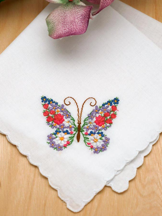 Love!! My favorite hankies to give as gifts. The butterfly embroidery is beautiful and sends a great happy message to my friends and family. The scallop edging around the entire hankie gives it a more expensive, prettier look. Size is perfect for any purse. All that and a great buy!!..