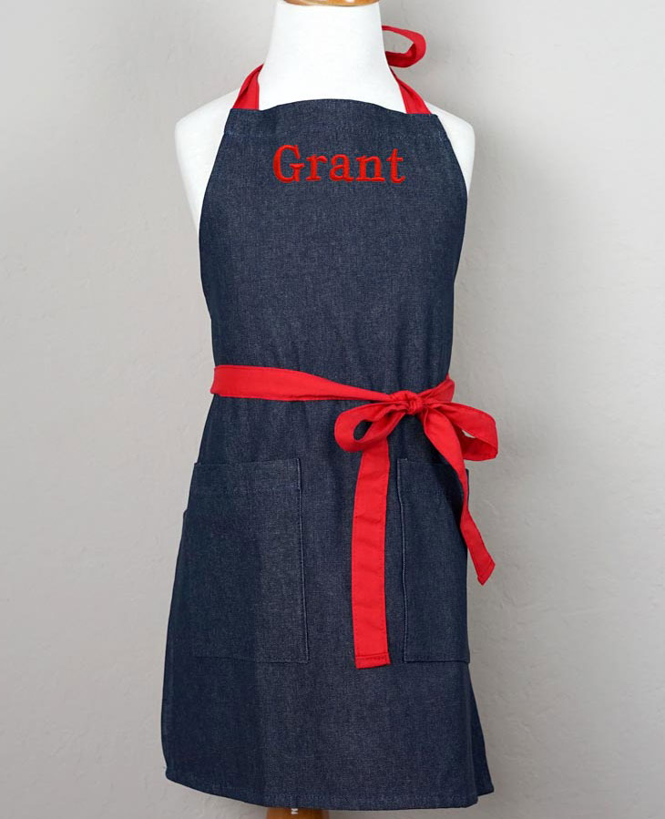 This kids' apron is crafted from 100% dark denim cotton, providing durability and a sleek look for young chefs. Measuring 20.5 inches by 21.75 inches, it’s designed to fit children aged 4-8. The apron features bold red ties, which are extra long to allow various styling options. Two sturdy front pockets add utility and convenience for holding small tools or ingredients. You can personalize it with a name or a monogram in eye-catching red embroidery, providing a vibrant contrast against the denim.