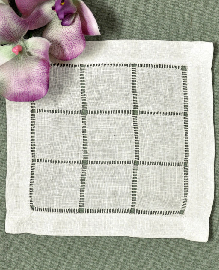 1 Dozen Ecru Grid Hemstitched Linen Cocktail Napkins