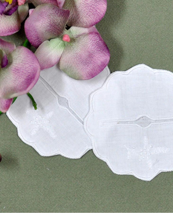 These cocktail wine footies are crafted from crisp white linen, each measuring 4" x 4" and designed to snugly fit standard wine glass stems. The design features a delicate floral cross embroidered in white, creating a subtle yet charming contrast on each piece. The scalloped edges accentuate their decorative appeal while remaining practical for keeping furniture safe from spills and stains.