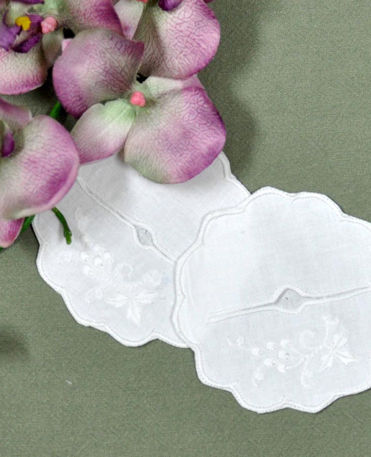 Our 1 Dozen White Cocktail Wine Footies, model WF-001, are crafted from fine white linen, featuring an intricate Tuscan vine embroidery design. Each footie measures 4" x 4" and is designed to wrap snugly around any standard stemmed wine glass or champagne flute. The delicate vine embroidery in soft white adds a touch of elegance, enhancing the visual appeal without overpowering the simplicity of the linen. A subtle scalloped edge frames each footie, providing a classic finish.