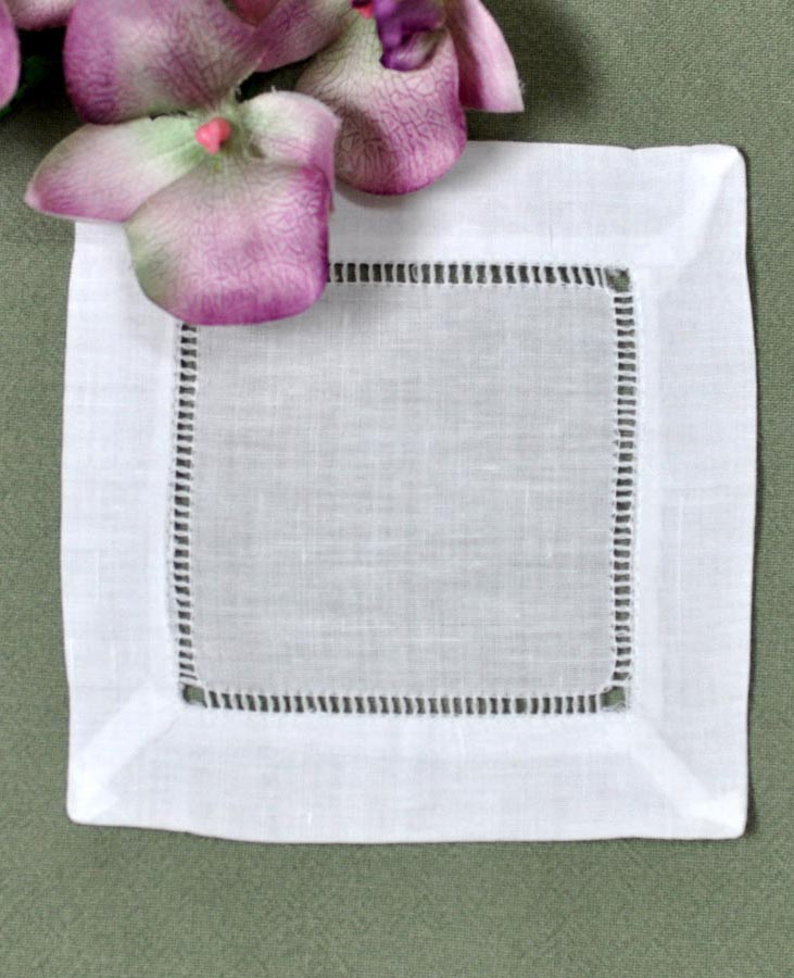 White Hemstitched Linen Cocktail Napkins 6in