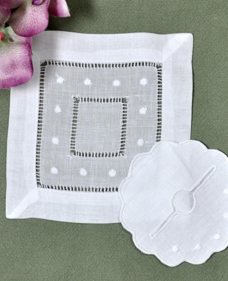 White Hemstitched Linen Cocktail Napkins With Dots