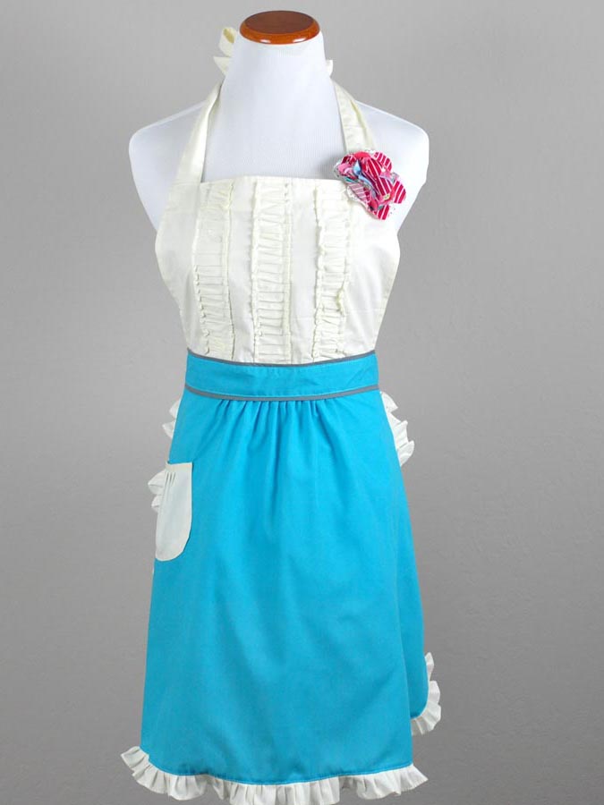 This retro-inspired apron features a charming cream top resembling a ruffle tuxedo, complemented by a matching cream ruffle at the hem. A vibrant flower brooch adds a playful accent, contrasting beautifully with the teal skirt. Long cream ties and a convenient cream pocket enhance its practicality, while the soft, 100% cotton material ensures comfort. The apron measures 10 inches from neck to waist and 18 inches from waist to hem, with a 20-inch waistband plus two ties on each side.