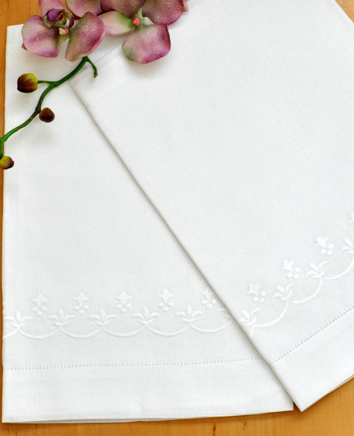 White Hemstitched Cotton Pillowcases With Fleur De Lis