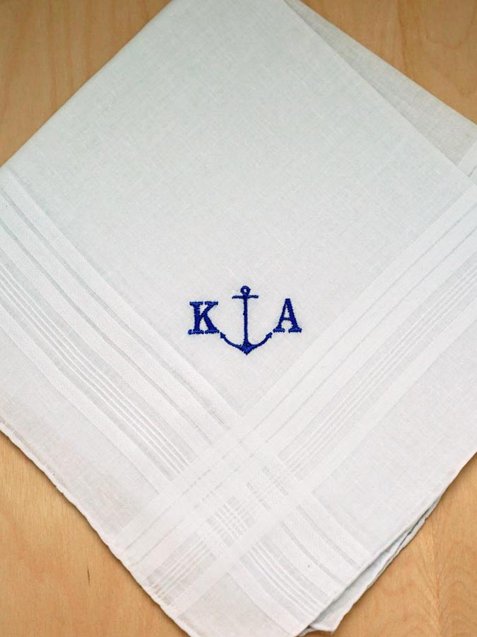 The Mens Monogrammed Nautical Anchor Handkerchief features a classic 17" x 17" square shape made from 100% cotton, offering a soft and smooth texture. Its design includes subtle satin stripes and a striking monogram embroidered in dark blue thread (or the color of your choice), centered with a nautical anchor motif flanked by two initials. The crisp white fabric contrasts beautifully with the deep blue embroidery, adding a personalized touch.