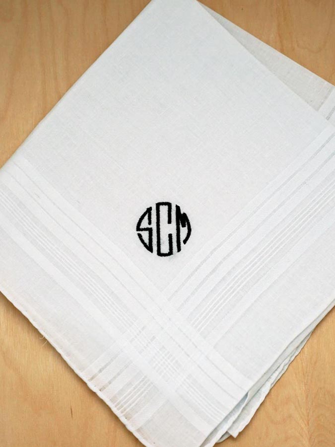 Mens Monogrammed Wedding Hankie w/ 3 Initials - Font DMens Monogrammed Wedding Hankie w/ 3 Initials - Font D