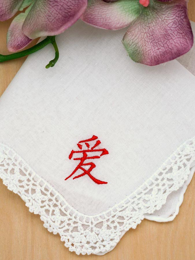 The Monogrammed Chinese Love Symbol Handkerchief features a pristine white, 100% cotton base with delicate scallop corner crochet lace edges. The standout element is the vibrant red embroidery of the Chinese character for love, centrally positioned, creating a striking contrast against the soft fabric. Measuring approximately 12" x 12", this handkerchief promises both visual and tactile elegance.