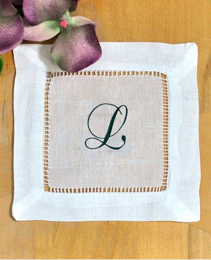 This set of 4 monogrammed linen cocktail napkins offers a refined touch with a hemstitched border that frames your chosen feather script initial elegantly on either ecru or white linen. The personalized monogram appears prominently at the center in the color of your choice, providing a contrast that highlights both the script and the fine texture of the fabric. These napkins combine a sophisticated look with tactile softness, perfect for enhancing your table setting.