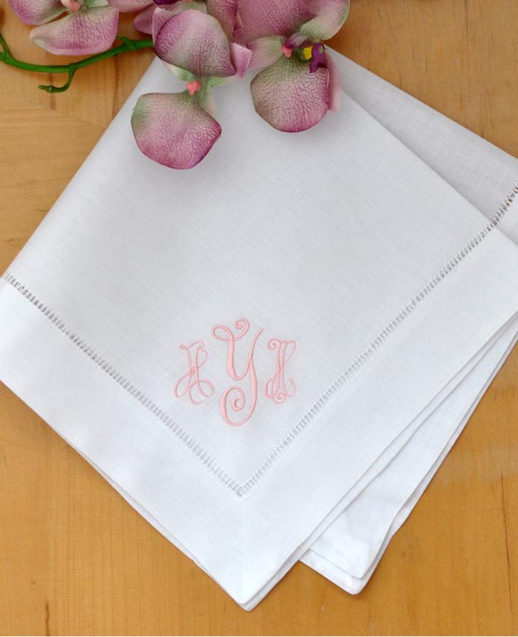 These monogrammed dinner napkins are crafted from pure white linen, featuring a delicate hemstitched border that adds a touch of refinement to any table setting. Measuring either 18 or 20 inches, each napkin in the set of four can be personalized with a three-letter Victor script monogram in your choice of color, elegantly contrasting against the crisp white fabric. The monogram is centered on the lower corner, enhancing the napkin's sophisticated design.