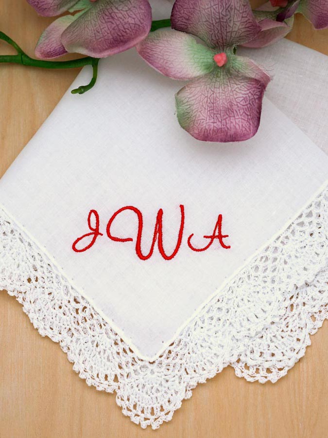 This Monogrammed Wedding Hankie features a delicate, scalloped crochet lace trim on all edges, crafted from 100% soft cotton. Measuring approximately 12" x 12", the handkerchief is personalized with a vibrant red three-initial monogram in a casual script font, offering a striking contrast against the white fabric. The monogram, with a slightly larger centered last name initial, adds a touch of individualized charm.