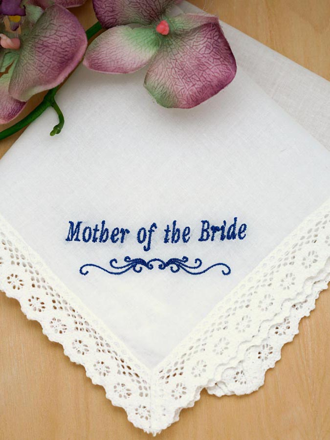 The Mother of the Bride Personalized Handkerchief features a delicate white base fabric with intricately designed lace edges, such as scallop crochet or cathedral lace, lending a classic touch to its design. The center is adorned with custom embroidery in your choice of colors, like a striking dark blue, elegantly contrasting the soft white fabric. Measuring approximately 12” x 12”, this handkerchief embodies both beauty and sentiment in its handmade design.