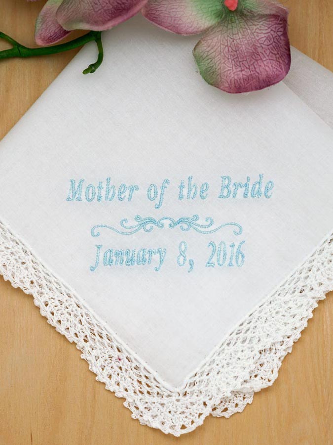 This Mother of the Bride handkerchief features a delicate scallop crochet lace edge, exquisitely crafted from white cotton. Personalize it with embroidery in your choice of thread color—like the gentle contrast of light blue against the pristine white fabric in the example shown. The handkerchief typically measures 12 x 12 inches, offering a classic square shape perfect for folding into a pocket or clutch.