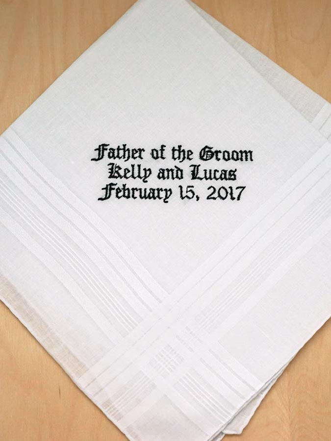 This personalized men's handkerchief features a 17 x 17-inch white fabric with elegant satin stripes, offering a refined texture. It allows up to four lines of custom embroidery in a classic old English font, subtly contrasting with the base material, using a thread color of your choice. Ideal for weddings, these handkerchiefs serve as thoughtful gifts for the groom, father-of-the-groom, or as a keepsake for other significant occasions like anniversaries, memorials, or religious ceremonies.