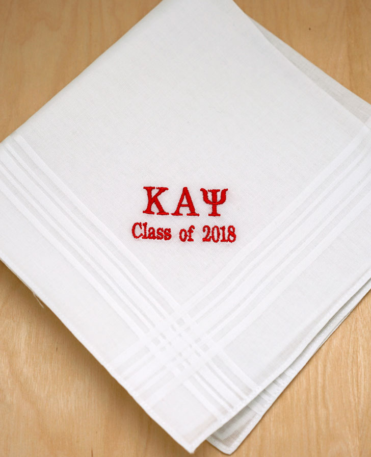 White with satin stripes, this men's handkerchief is crafted from soft, durable fabric. Featuring personalized red embroidery of Greek letters and graduation year, the design allows for a custom touch, contrasting vividly against the classic white base. The neat satin stripe pattern elegantly frames the embroidery, creating a refined and distinguished appearance.