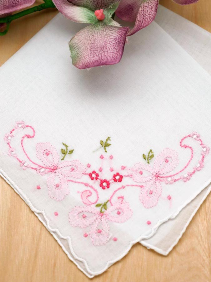 White and crafted from 100% cotton, this set of 3 handkerchiefs features delicate pink embroidery depicting charming wedding bows. The hand-sewn design is accentuated with soft, rolled edges, creating a refined 12" x 12" square. Pink floral motifs are intricately stitched at the corners, enhanced by subtle green leaf accents, providing a gentle contrast against the crisp white background.
